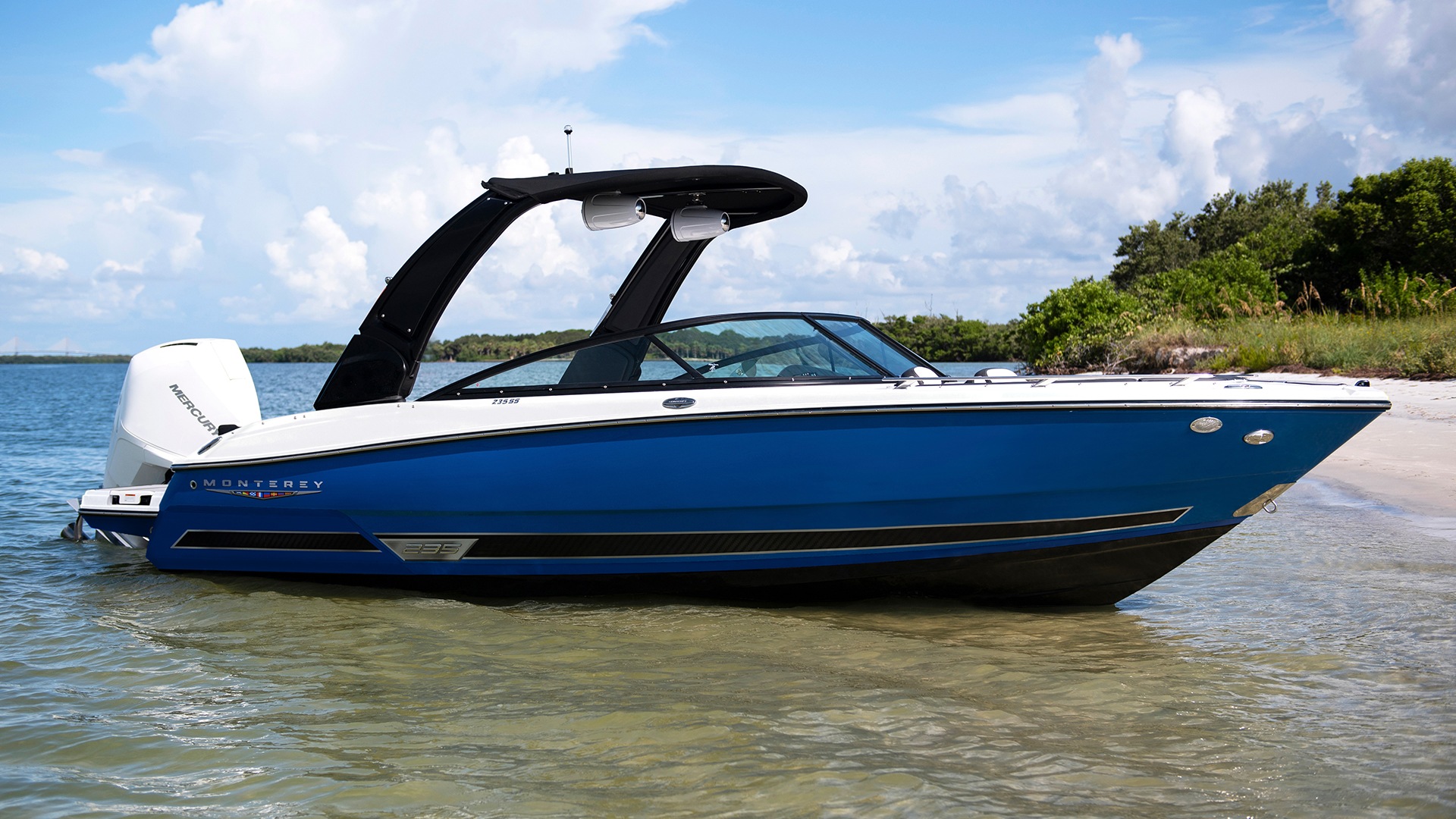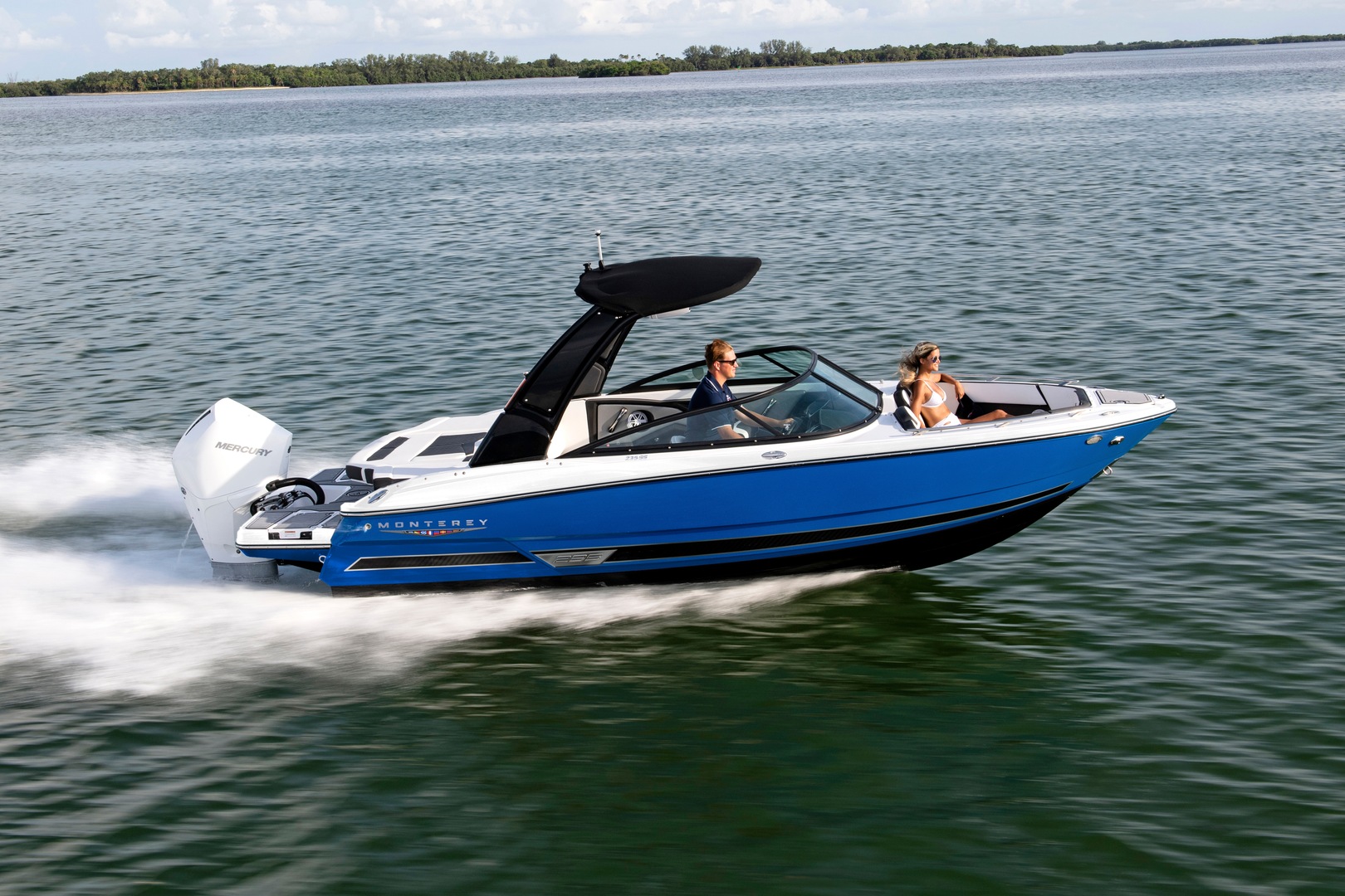 Sleek styling, powerful outboard performance, and luxurious seating options help make the Monterey 235SS the perfect choice. Equipped with luxurious aft sun-pad with aft facing flip-up bolster, the 235 is a sun worshiper’s delight! Standard features include an ergonomically designed helm station, multiple dedicated storage options, spacious seating accommodations, and telescoping and recessed boarding ladder. Add in the optional wakeboard tower, and you’ll have everything you need to enjoy your time out on the water to the fullest!
