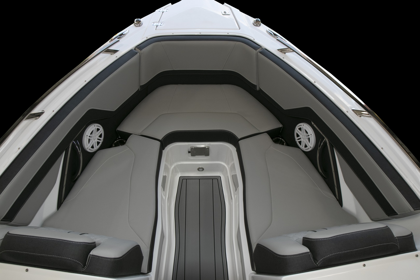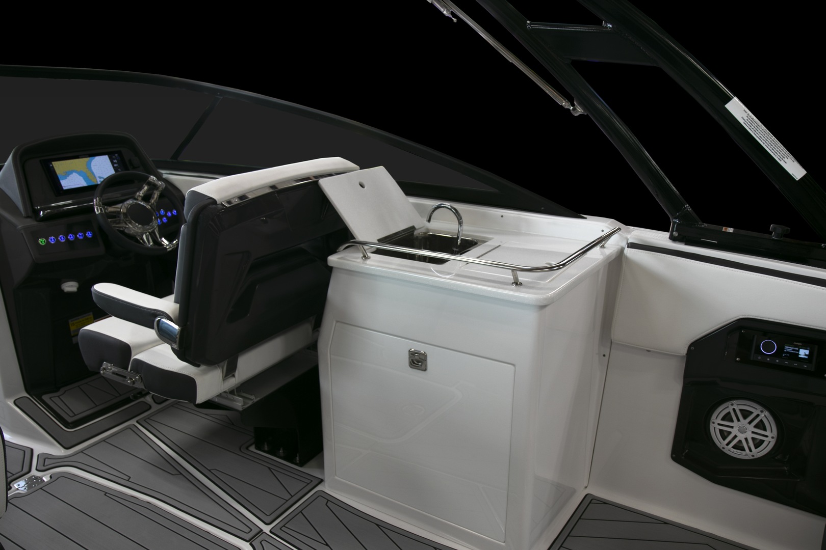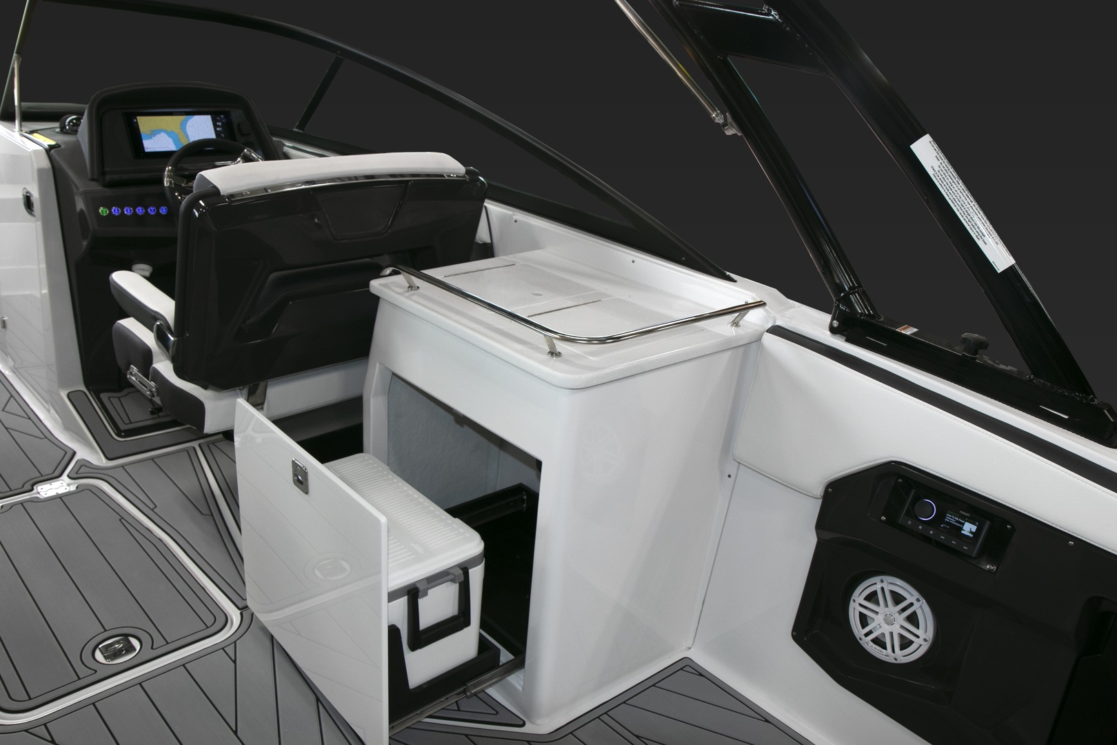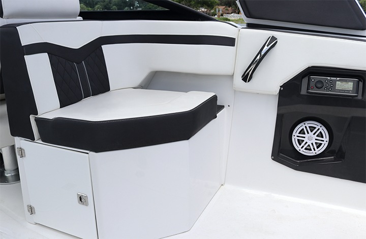 Loaded with an abundance of standard features and amenities, the 255SS features an ergonomically designed helm station with compass, depth sounder with shallow water alarm, digital GPS speedometer, instrumentation with fog resistant digital gauges and low glare night lighting, as well as power assisted tilt steering, making this a captain’s dream. A Fusion satellite ready AM/FM/Bluetooth stereo with built in iPod dock and 4 JL audio speakers, 8 stainless steel drink holders, 12V courtesy lighting, 48 court carry-on cooler, and telescoping and recessed swim ladder help to complete the package, making this the perfect vessel for all your on the water adventures