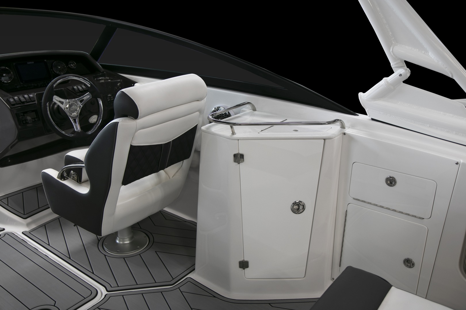 Spacious, Suave, and stylish, the M45 offers a unique blend of performance and comfort. Standard features include an ergonomically designed helm station, spacious seating options with custom dedicated storage, Fusion Satellite Ready AM/FM Stereo, as well as a wet bar with solid surface top, sink, and faucet. Add on the optional wakeboard tower to complete you’re on the water adventures!